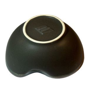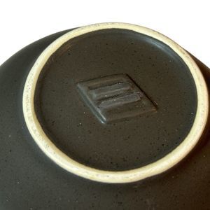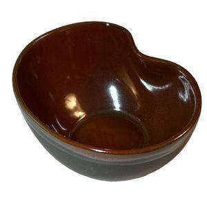 This vintage stoneware bowl features a unique kidney shape in a beautiful combination of grey and siena brown glaze. Its handmade art pottery production style adds to its charm and will make a great addition to any collection. The bowl is perfect for serving snacks, dips, or as a decorative piece. Its sturdy and durable material ensures longevity and the brown color complements any table setting. Add this one-of-a-kind piece to your collection today. Dimensions: 5" x 6.5" x 4"