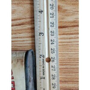 Measures 4-1/4" Tall x 2-1/4" wide. When I shake it, it doesn't sound like anything is inside. The paper is worn and marked up, the tin rusty, like you'd expect. Please view all photos.