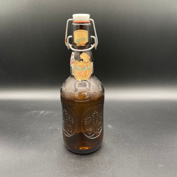 Vintage Grolsch Beer Bottle W/ Porcelain Top, Brown Amber Glass, Embossed 16 Oz