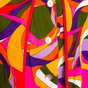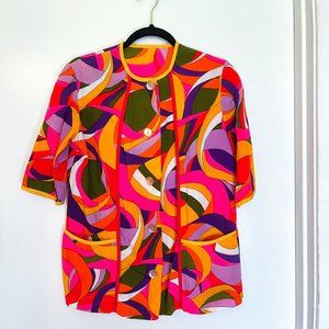 Amazing groovy smock button down shirt, handmade from 1960's-1970's! Features bright bold and colorful abstract pattern of purple, pink, yellow, white, and green. No tags but feels like cotton and fits like a women's small/medium. Due to the secondhand nature of this vintage item, there are some light signs of wear like discoloration (pictured) and thinning of fabric.