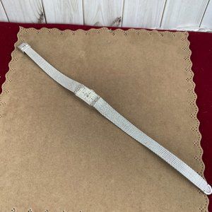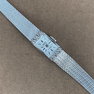 Vintage All Most New Gruen Precision 17 Jewel 1950's Mid Century Ladies Diamond Watch White Gold 10K Gold Filled. Case is marked Stainless Steel back, Mesh 7.2 inch 1/20 10K Gold Filled Strap . Movement marked Gruen Precision, Switzerland 17 Jewels Swiss Movement, 673N. Sets, winds, and runs.
