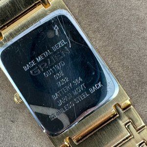 Vintage Gruen Man's 6 Diamond Quartz Watch with Date at 6, Enameled Midnight Black Dial, Gold hands and Raised markers 1.5x1 inch Art Deco Styled Tank Case with 6 Diamond Bezel Heavy Gold Plated Link 8 Inch by 1 inch wide Bracelet (has extra Clasp Link) Stainless Steel Back Marked GU1197D 038 VJ32, Japan Movement Pre-Owned, Very Good Condition, New AG1 Battery will add a spare. Really, Really Nice Man's dress styled Watch