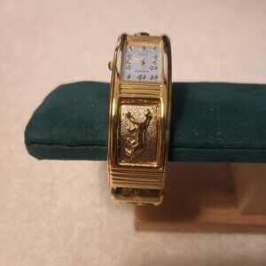 Vintage 1980s Panther bracelet watch designed as a Hinged Bangle. Easy to wear and stay in place. Measures 13/16" wide and fits wrists up to 6 3/4". Inside measurements 2"x2 1/4" across. Never worn, in new condition with new battery.