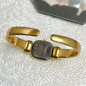 Vintage Gruen Precision diamond accented black dial hinged bangle watch. Watch features a gold-tone cushion case with black dial and hinged bangle. The black dial has a tiny diamond accent at 12 o'clock and is marked, "Precision, Quartz, Gruen" and "GPR 269" at bottom edge. Case back is marked, "Precision by Gruen, Base Metal Bezel, 300-401.101, Swiss Mov't Parts, Thai Assembly, Stainless Steel Back, Base Metal Bezel." Watch case measures approx. 20mm across excluding crown, and watch with hinged bangle should fit a max wrist size of approx. 6 1/4" (with bangle closed). Watch is in good vintage condition with a visibly clear crystal and light scuffs / scratches to the case and band. I can see a tiny scratch near 7 o'clock at edge with magnification that is not visible to me otherwise. Also has wear to the finish on the crown and a slight indentation in the case back. Watch has a new battery and keeping time. Thanks for checking out my closet!