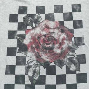 Channel rebellious energy with this rose-meets-checkerboard graphic tee. This one-of-a-kind cut-off shirt pairs punk rock flair with floral edge, printed on ultra-soft 100% cotton. Featuring raw-sleeve edges and a vintage wash, it’s the perfect staple for anyone embracing grunge, alternative, or skate fashion. Wear it oversized or tuck it into distressed denim for a statement look.