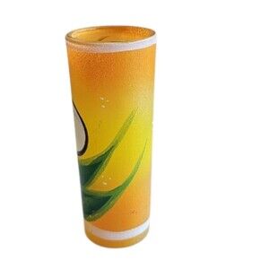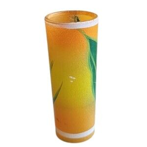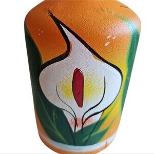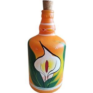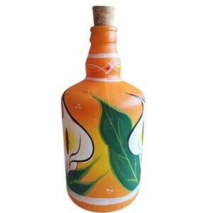 Featuring vibrant calla lily floral motifs hand-painted on a bold orange-yellow glass, this set includes a corked decanter and 6 matching shot glasses, beautifully displayed on a carved wooden stand