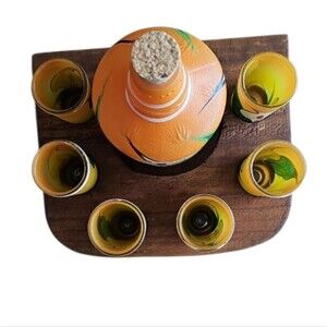 Vintage Grupo Corona Mexican Barware Set Hand-Painted Decanter + 6 Shot Glasses