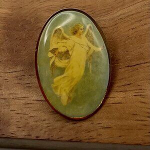Vintage Guardian Angel Lapel Pin Oval Religious Christian Ethereal Mid Century