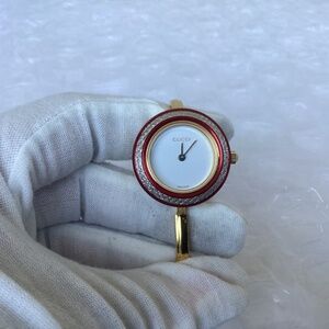 This is a Preowned Vintage Gucci Interchangeable Bezel Bangle Watch and it’s in Great Condition with a light visible wear around the bangle, watch based and clasp.