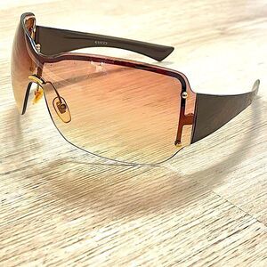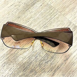 These stunning Gucci sunglasses feature a one-piece wrap-around lens with a chic amber gradient, adjustable nose pads, and brown acetate arms with the signature Gucci GG Monogram pattern.