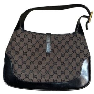 Gucci Canvas Jackie Shoulder Bag features black cowhide leather trim that adds an elegant touch to its overall design. The looping adjustable shoulder strap ensures comfort while carrying the bag all day long.