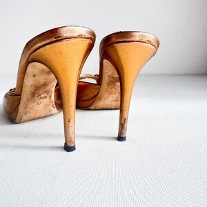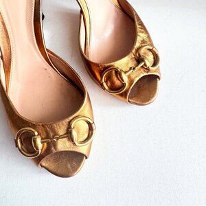 Vintage Gucci Metallic Bronze Gold Horsebit Detail Peep Toe Heels 37