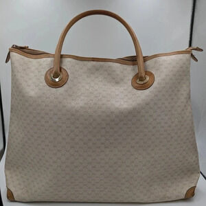 This gorgeous vintage Gucci Micro GG Tote Bag in beige canvas with leather trim is a timeless addition to any collection. Featuring Gucci’s signature monogram pattern, this tote exudes elegance and sophistication. The spacious interior is perfect for daily essentials, making it both stylish and practical for everyday use. The bag has a sturdy leather handle, gold-tone hardware, and is in great vintage condition with minimal wear on the corners and leather trim.