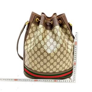 Elevate your style with this iconic Gucci Bucket Bag, crafted from the classic GG monogram PVC canvas with brown leather trim and the signature green-red-green web stripe. Perfect for daily use, this timeless piece blends practicality with luxury.