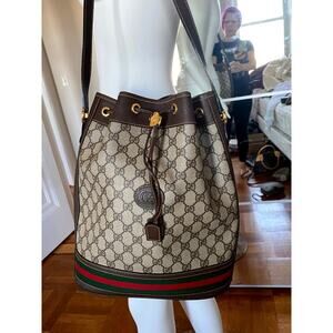 Vintage Gucci Monogram Bucket Bag with Web Stripe โ Brown