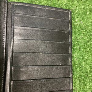 Vintage long wallet from Coach. Not sure the year, my best guess is perhaps 80s? Black leather with black and gray canvas. Monogram GG print all over. Gold tone hardware, some of it has warn down over the years. The Kiss lock closure has GG on it. Can fit cards or coins in it. The other side has a snap closure with a tri fold wallet. Large enough for a checkbook, with a snap closure inside. Lots of spaces for cards and other things. The edging has wrinkles and there's some marks and such on the inside. Edging has some wear as well. Please see photos.