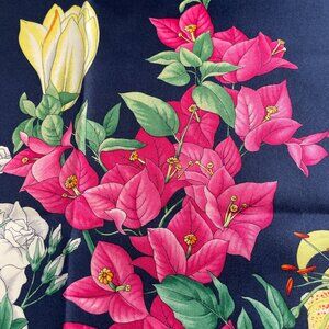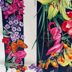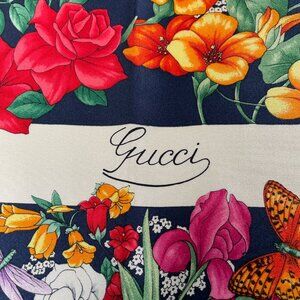 Step into timeless elegance with this exquisite vintage Gucci silk scarf, crafted in Italy and finished with a hand-rolled hem. Featuring Gucci’s celebrated Flora motif—a lush garden of blossoms, butterflies, and greenery against a deep navy background.