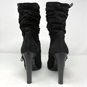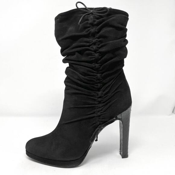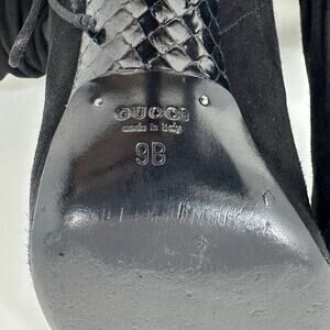 Gucci vintage suede boots with sleek python‑print stiletto heel — a striking statement piece from the Tom Ford‑era (early 2000s), when Gucci redefined luxury footwear with bold glamour. Soft black suede upper with ruched design gives a dramatic silhouette; python‑embossed heel adds luxe vintage edge.