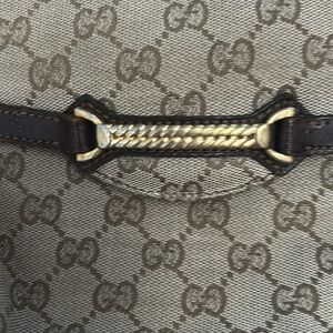 Chic Gucci shoulder bag with iconic pattern. Tan canvas with gold accents. Perfect for stylish outings.