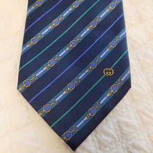 Men's Gucci silk tie. Navy blue base with gold horse tack and light blue stripes. Classic, logo, italian, made in italy.