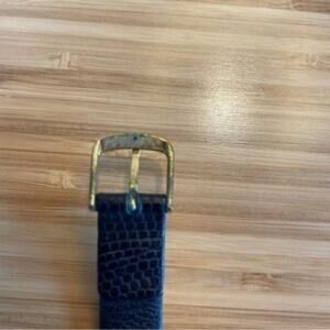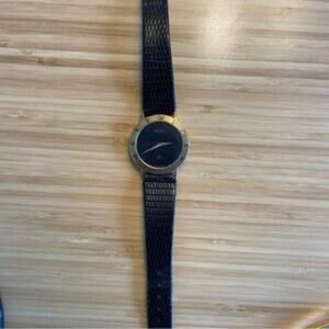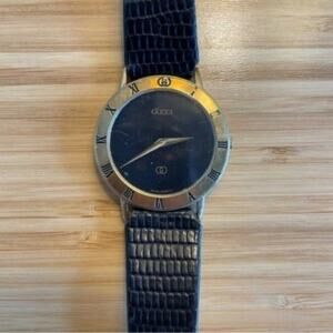Beautiful vintage Gucci watch. Gold plated with black leather band. There is wear on the face. Works great and is a timeless piece. Is missing the strap to hold down the watch band when worn.