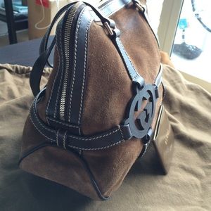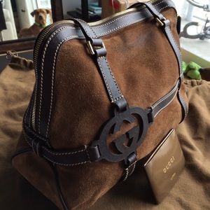 Brown suede with leather Gucci label. Comes with authenticity card and dust bag.