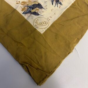 Chic Gucci scarf with bird motifs. Mustard hue enhances its elegance.