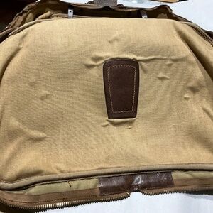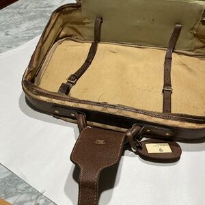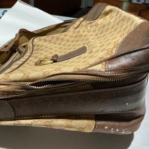 1972 Gucci suitcase: 20” wide, 17” high, 6.5” deep. Very good condition. Logo canvas & leather. Includes Gucci luggage tag. The white dots on the leather corner come off if gently scraped.