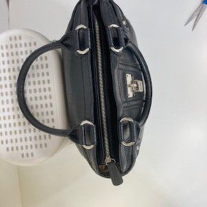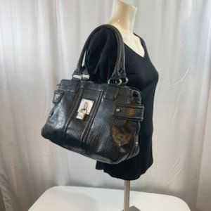 Guess Black Leather, Chrome Hardware, Size 14x7x9, Handle drop 8", Interior Fabric with Nostalgic GUESS logo, Chrome lock/plate surface scratches. Overall good condition