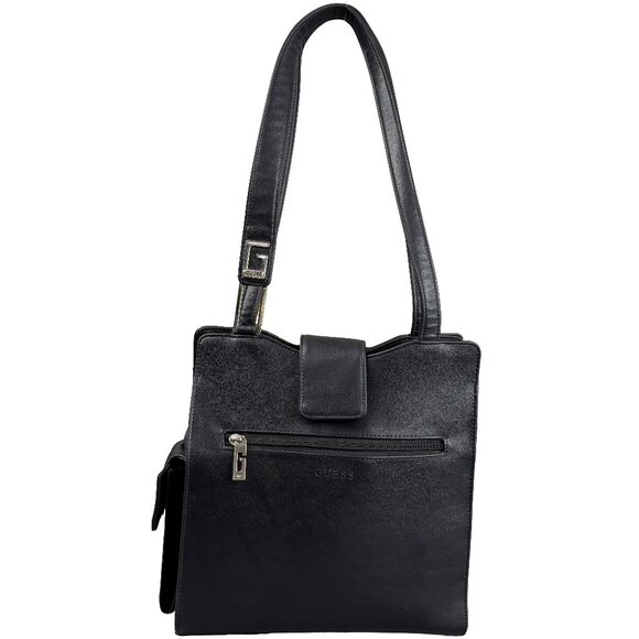 Vintage Guess Black Leather Shoulder Bag Crossbody Zip Pocket Logo Hardware