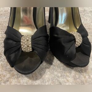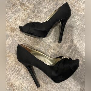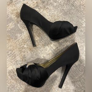 Vintage Guess Classic Black High Heel Peep Toe Pumps Sz 7M Satiny Rhinestone Y2K