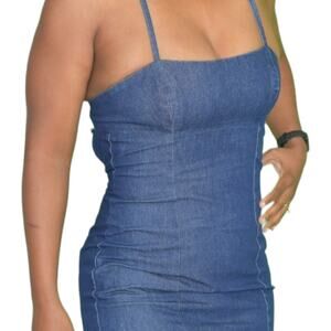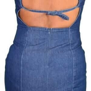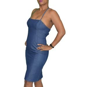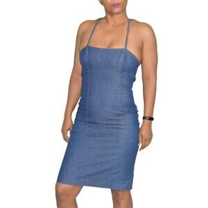 Vintage Guess Denim Dress Blue Jean Bodycon Pencil Halter Back Ties Size Small