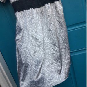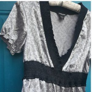 Vintage Guess Dress Retro Romanic Flirty Fit n Flare dress Puff Sleeves Plunging V Neck and accentuated Waist Romantic Date Night Dress to impress silver and black metallic dress Classic Vintage Guess Mini Dress Deep Vneck Silvery. Retro Glam Cute flirty dress great for date night. Both the waist sleeve's edge and neckline have soft elastic.