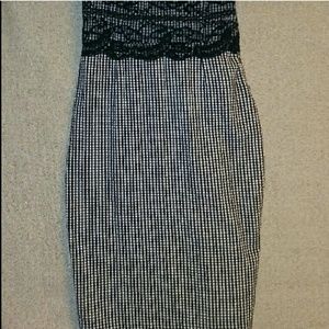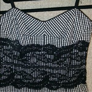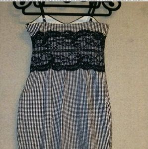 Spaghetti strap lace heart-shaped neckline. Black and white checkered A-Line bodycon dress. Beautiful black lace overlay under the bust. Hem hidden closure.