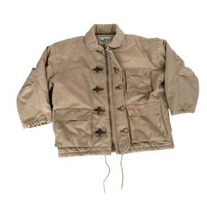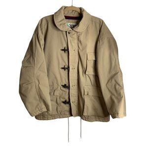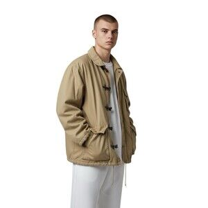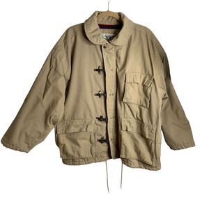 The Vintage OVERSIZED Guess Jeans American Tradition USA Bomber Chore ANTIQUED GOLD TOGGLE AND ZIP CLOSURE WITH LARGE PATCH POCKETS Jacket is a stylish and rugged outerwear piece perfect for the colder seasons. Made with a durable cotton outer shell and lined with cozy nylon, this mid-length jacket features a relaxed fit and button, zip, and toggle closures for added warmth. The brown color and solid pattern give it a classic and timeless look, while the pockets and all-season features make it versatile for various occasions. Whether for work, travel, or casual wear, this bomber jacket is a must-have addition to any wardrobe.