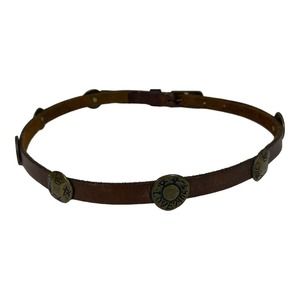 Vintage Guess Leather Embellished Belt. Unique style. Distressed brown leather narrow belt with bronze toned medallions. Medallions have engraved designs like "Love Must" and stars. A great layering piece. Made in USA.