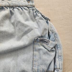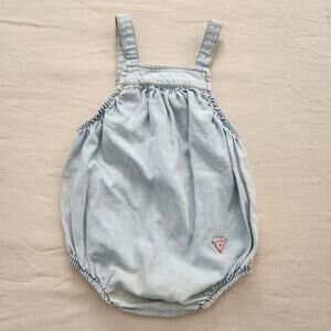Vintage Guess light wash denim bubble with adjustable marble buttons at straps! Note a few light spots shown on bum, leg opening, and chest - untreated by me. Please see all photos for condition and measurements Size 2t fit up to 3t, 24m per tag