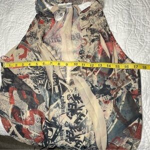 Step back into Y2K style with this stunning vintage Guess Los Angeles halter blouse. Made in the USA from imported fabrics, this piece features a bold collage-style graphic print with edgy newspaper and logo designs in shades of black, red, cream, and gray.