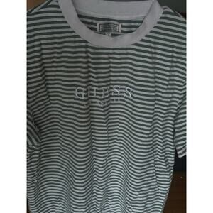 Vintage Guess Originals White & Green Striped Tee with Embroidered Logo – Size M