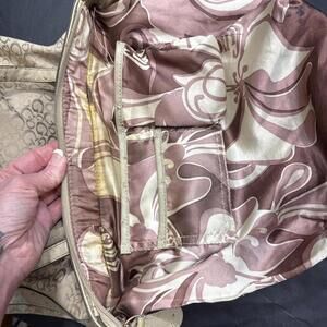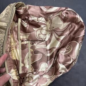 Guess Vintage Y2K Logo Medallion Beige Monogram Purse in good to fair preowned vintage condition as there are several untreated stains on the bag & some of the edges on the handles have started peeling off...