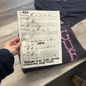 Vintage Guess Sweatshirt 80s 90s Charcoal Gray Womens L Spellout Crewneck USASweatshirt. paint splatter front back and sleeve, , charcoal gray with accented purple "Guess?" logo, lightweight, long sleeve, crewneck, pullover, retro sweats, cotton poly blend, made in USA
