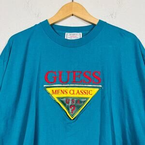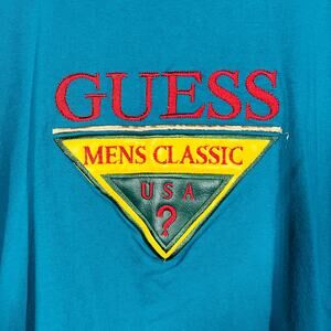 Vintage Guess Tee Short Sleeve Mens Classic Casual Crop Waist Teal Embroider XL