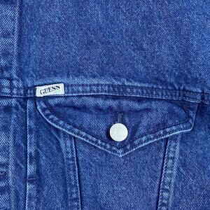 Vintage Guess USA by Georges Marciano denim trucker jacket. Classic medium wash denim with button front, dual chest flap pockets, and side hand pockets. Features branded Guess buttons and tab. A true Made in USA piece from the Marciano era — highly collectible.