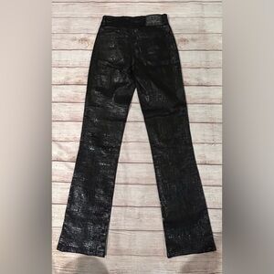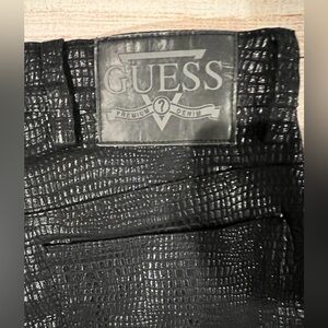 Vintage black reptile shiny high rise straight leg pants from GUESS. Perfectly capturing the 90s vibe, these pants are made from a comfortable blend of spandex and cotton, ensuring a flattering fit for any body type. The waist size is 24 inches, 9.5" rise and 31" inseam. Embrace the timeless style of these GUESS pants, a perfect addition to any women's clothing collection. The straight leg style, combined with the unique reptile pattern, makes it a versatile piece that can be worn for any occasion. Don't miss out on the chance to own these stunning pants. They have stretch! Smoke free home.