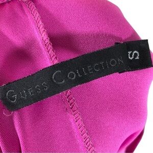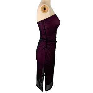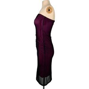 Features: This is a classic 90s/y2k dress. Strapless. Slimming. Slightly stretchy Black mesh overlay with a fuchsia underlining. Rushed side detail. Side slit. Silicone trim along the inner neckline for anti slipping. Pull over.