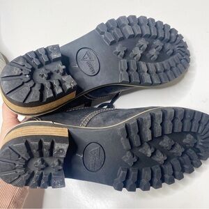 Soft black leather uppers, lace up shoes. Nearly 2” heel, lug sole