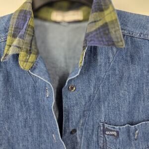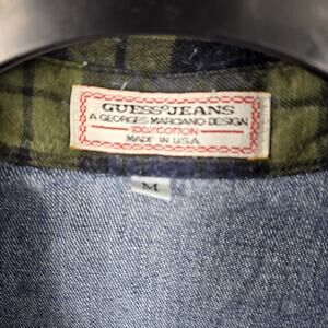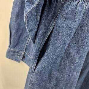 The Vintage Guess by Georges Marciano Women's M Blue Button Denim Long Sleeve Dress is a stylish and versatile piece that perfect for various occasions. Made of cotton denim in a solid blue color, this knee-length dress features a collared neckline and button closure. With a retro 90s vibe and accents like a plaid collar and pockets, it offers a unique and timeless look for the fall, winter, or spring seasons. Perfect for travel, parties, or casual wear, this dress is a must-have for any fashion-forward woman's wardrobe.