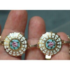 Beautiful vintage pink roses guilloche enamel bracelet. Very pretty, and unusual, with the guilloche plaques set in the center of white enamel sunburst or starburst design. Gold tone metal with foldover style clasp, unmarked.