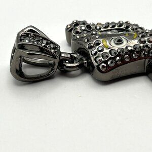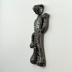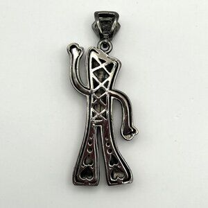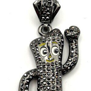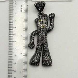 Unique rhinestone pendant featuring Gumby, the iconic clay animation character. This silver tone pendant is fully encrusted with dark sparkling rhinestones, with enamel detailing on the eyes and face. A wide decorative bail allows it to be worn on a thick chain or cord.