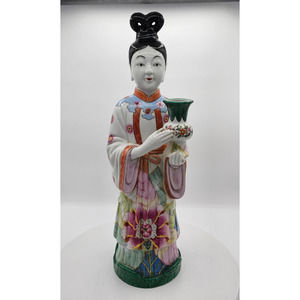 Vintage Gump's Chinese Export Porcelain Court Lady Vase Candleholder 17.5" Tall and 5" base of dress. Pristine condition. EXTREMELY RARE! Earrings are possibly missing as there are holes for earrings. Made of porcelain, hand painted, and has the GUMP's stamp on the bottom (founded in 1891 in San Francisco). NO Chips or cracks!